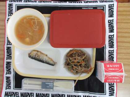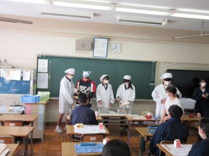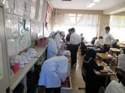 3年生,給食準備・配膳の様子です。協力しながら進めています。今日の献立は「ごはん,いわしのゆずすだちおろし煮,五目きんぴら,玉ねぎの味噌汁,牛乳」です。