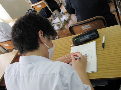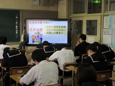 3年生の社会の授業です。公民分野です。今日は,時代とともに変化する地域の課題に行政はどのように向き合っているのか?について考えています。資料をもとに一生懸命考える姿が多く見られます。頑張って!
