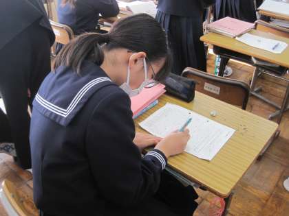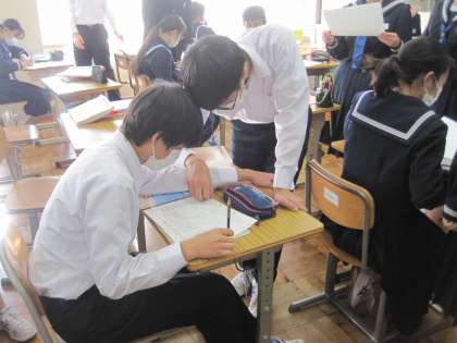 3年生の国語の授業です。和歌の鑑賞文を書いています。一度書いたものを推敲して完成させます。友達とも見合いながらより良い鑑賞文を目指して,進めていました。
