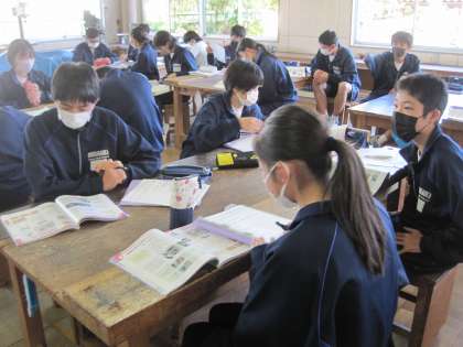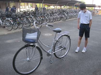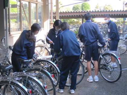 2年の技術科の授業です。「機械の保守点検をしよう」という単元で,自転車点検をしました。自転車の点検やタイヤの空気を入れる等簡単な調整も自分で行うことができるよう確認をしながら,点検をしました。