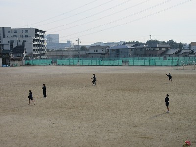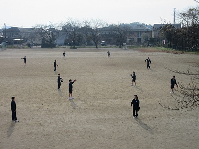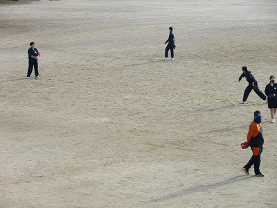 3年生の保健体育の授業です。グラウンドではベースボール型のソフトボールに取り組んでいます。まずはキャッチボールです。みんな楽しそうに活動しています。