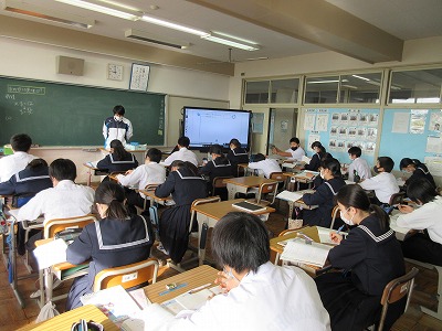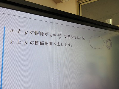 1年生の数学の授業です。今日は,反比例の意味について考えています。これから各自問題に取り組みます。頑張れ!