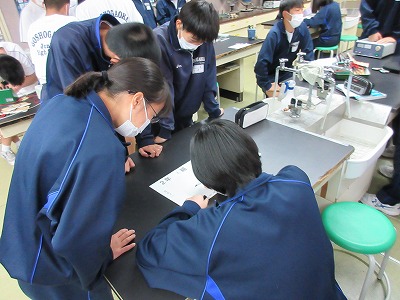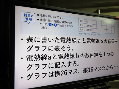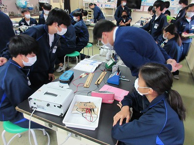 2年生の理科の授業です。実験の様子です。今日は,電流と電圧の関係性を捉えようとしています。グループ毎に熱心に取り組んでいます。