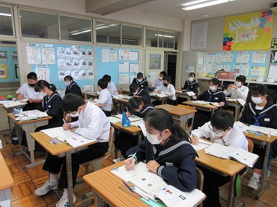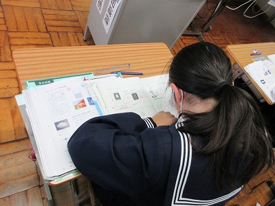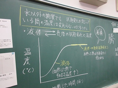 1年生の理科の授業です。科学分野です。今日は,水以外の物質でも状態変化が起こっている間は温度は変わらないだろうか?との学習課題に取り組んでいます。各物質の温度変化による沸点や融点を確認することで結論についてまとめています。みんな真剣です。