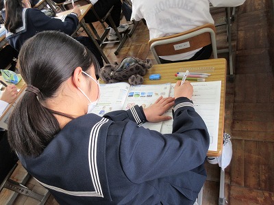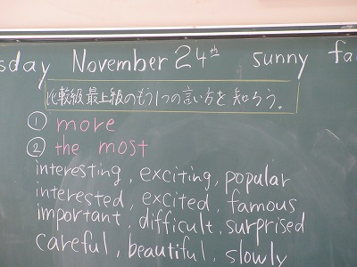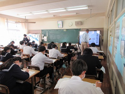 2年生の英語の授業です。今日は,比較級最上級のもう一つの言い方について学んでいます。ALTの説明に真剣に耳を傾けています。頑張れ!