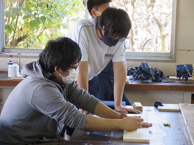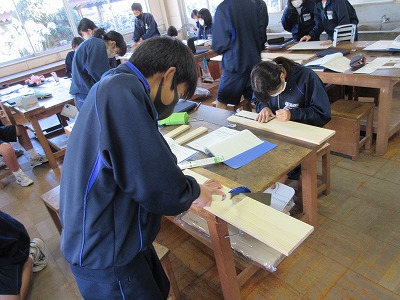 1年生の技術の授業です。今日は,木工室にて木材加工の学びです。自分にしかない木材製品の制作です。みんな一生懸命に取り組んでいます。頑張れ!