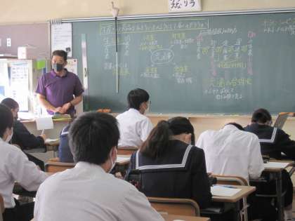 3年生の社会科の授業です。流通についての学習です。図で示しながらの説明で生徒たちもノートをとりながら集中して取り組んでいました。