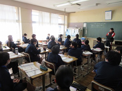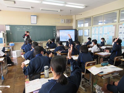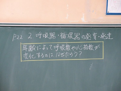 1年生の保健体育の授業です。保健分野で座学です。今日は,呼吸器の循環器の発育・発達について学んでいます。先生と仲間達がしっかりやりとりしながら授業が進んでいきます。