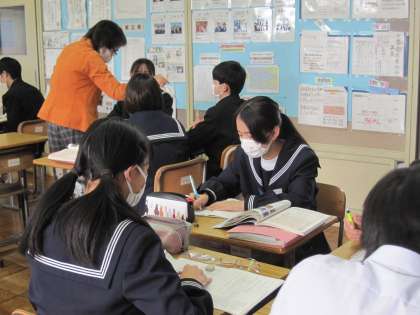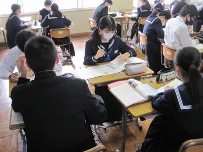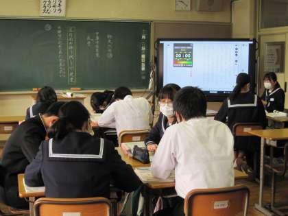 3年生の国語の授業です。「おくのほそ道」の中の俳句について,俳句に込められた芭蕉の思いについてグループで話合いをしました。