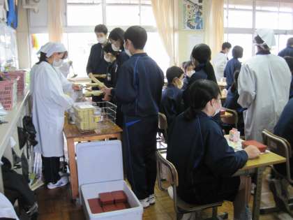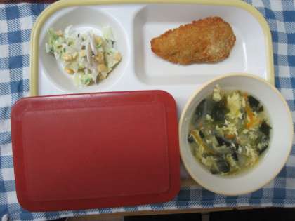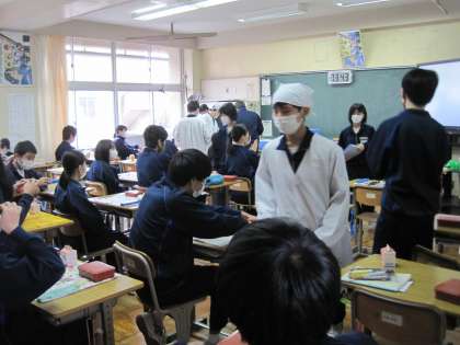 3年生の給食準備・配膳の様子です。協力しながら進めています。今日の献立は「ごはん,鮭フライ,守谷市産れんこんサラダ,かき玉汁,牛乳」です。