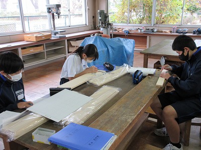 1年生の技術の授業です。木材加工を学んでいます。自分なりの作品を仕上げるための木材加工方法をそれぞれのペースで作品を作製しています。頑張ってます!