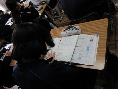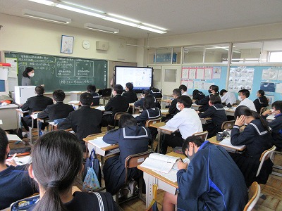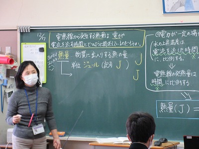 2年生の理科の授業です。今日は,電熱線から発生する熱量は,電力や電流を流す時間とどのように関係しているであろうか?ということについて考えています。先生の熱い解説をみんなしっかり聴いています。頑張れ!