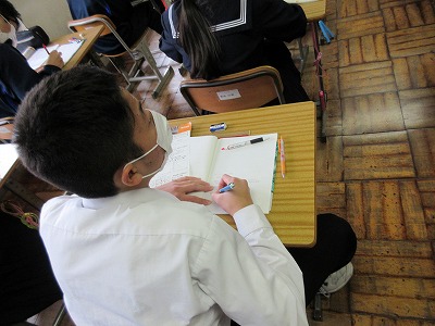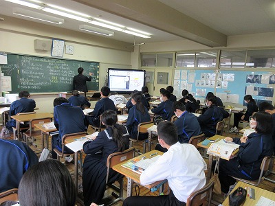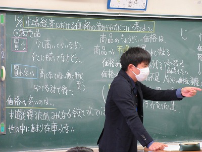 3年生の社会の授業です。公民分野です。今日は,市場経済における価格の決められ方について考えています。需要と供給のグラフから検討しています。みんな集中しています。