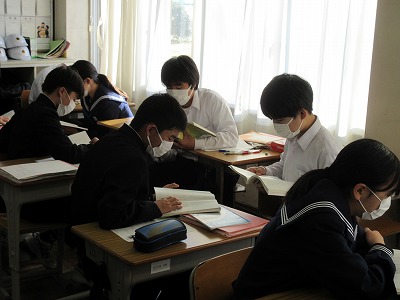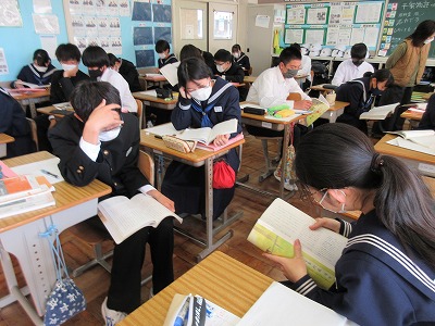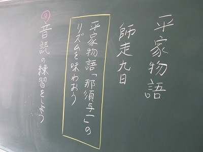 2年生の国語の授業です。古典です。今日は,「平家物語『那須与一』のリズムを味わおう」という学習課題でお互いに読み合っています。独特のリズムを体感しています。