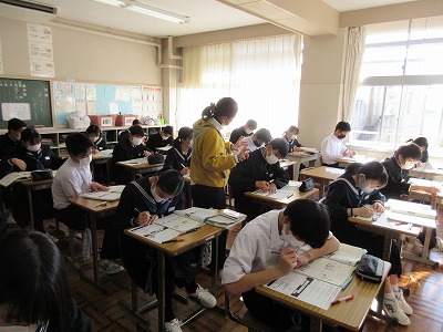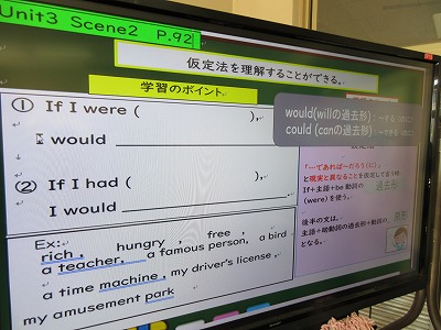 3年生の英語の授業です。今日は,仮定法の表現について学んでいます。If〜 です。みんな真剣に取り組んでいます。
