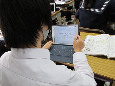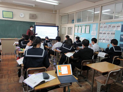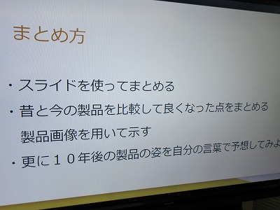 2年生の技術の授業です。製品についての学びです。今日は,昔と今の製品の違いについてタブレットで調べて,パワーポイントでまとめるためのガイダンスを行っています。