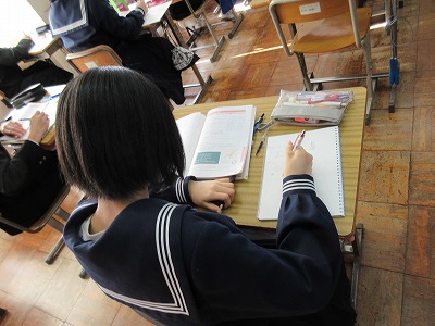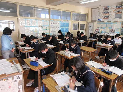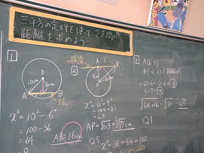 3年生の数学の授業です。今日は,三平方の定理を活用して2点間の距離を求めようとしています。みんな一生懸命考え,真剣に取り組んでいます。