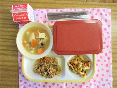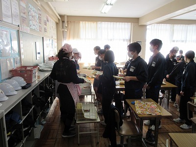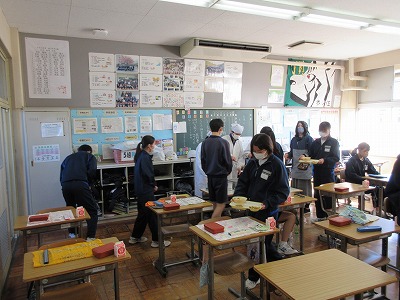 3年生の給食準備・配膳の様子です。4時間目移動教室に授業では時間に遅れ気味になりますが,当番が先を見てしっかり準備してくれています。今日の献立は「ごはん,豚丼の具,煮浸し,みそけんちん汁,牛乳」です。