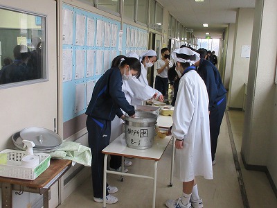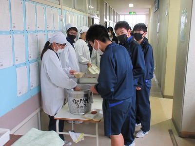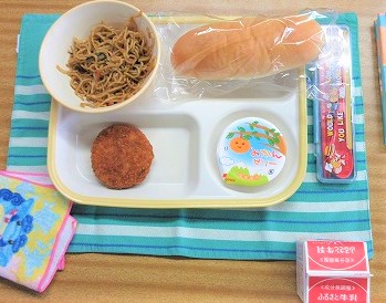 2年生の給食準備・配膳の様子です。当番の生徒がリードして配膳がスムーズに進んでいます。素晴らしい。今日の献立は「ミニコッペパン,ごぼうメンチ,焼きそば,みかんゼリー,牛乳」です。