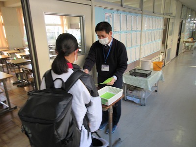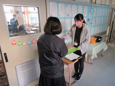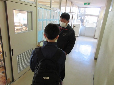2年生,廊下での健康観察の様子です。寒くなってきました。廊下にいる先生方も仲間達の登校を待っています。ここでの一言から一日が始まります。大事な時間です。