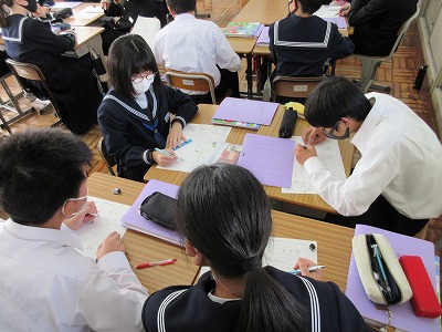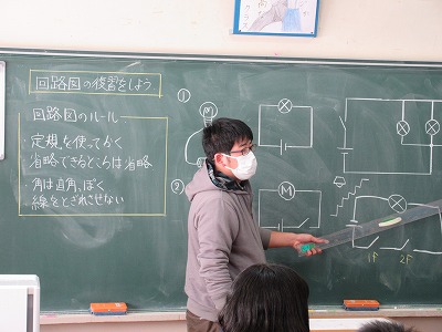 2年生の技術の授業です。回路図について復習しています。どのようなつなぎ方をするとよいのか,グループでも確認しています。