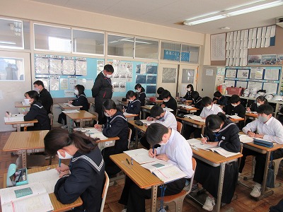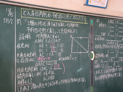 2年生の数学の授業です。今日は,どんな四角形が平行四辺形と呼べるのだろうかを考えています。みんな頑張ってます!