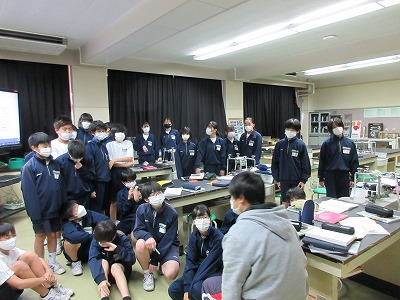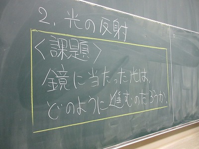 1年生の理科の授業です。光の反射について学習しています。今日は,鏡に当たった光はどのように進むのかを考えています。次の時間が実験です。