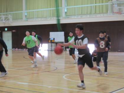 3年生の体育の授業です。サッカーかバスケットボールを選択して取り組んでいます。どちらもチームで協力してゲームをしていました。