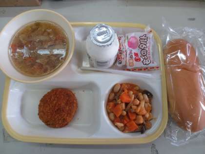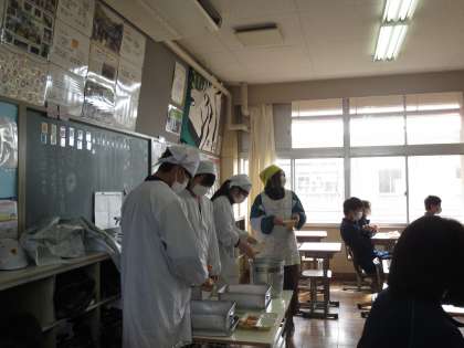 3年生の給食準備・配膳の様子です。どの学級も静かに進んでいます。給食の時間中は「黙食」です。今日の献立は「ミルクパン,カレーコロッケ,鶏肉のトマト煮込み,冬野菜のスープ,桃タルト,飲むヨーグルト」です。