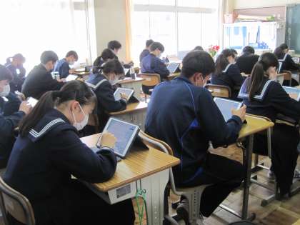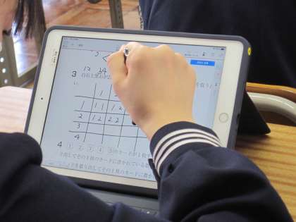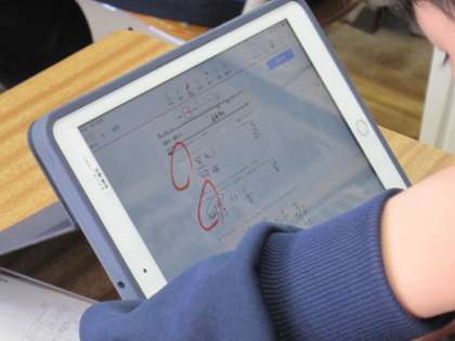 2年生の数学の授業です。タブレットを使って、問題を解きました。Metamojiというソフトを使って、タブレットに直接書き込み、自分で採点します。先生もタブレット上で子供たちの解答の様子について見ることができます。