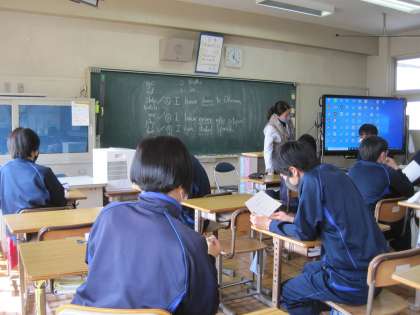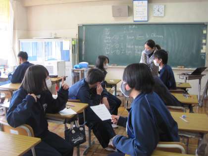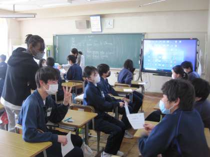 3年生の英語の授業です。自分のことについて3文考え、そのうちの1文だけ嘘の内容が含まれているので、それを当てるゲームをしました。最後の英語の授業を、いろんな人とコミュニケーションをとって楽しく行いました。