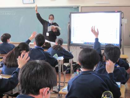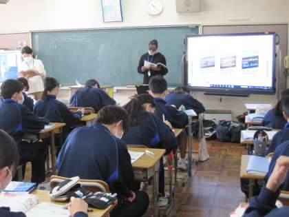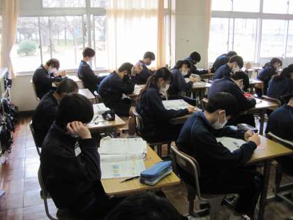 2年生の英語の授業です。教科書の英文をもとに、リスニング問題に答えているところです。内容をよく聞き取って解答していました。