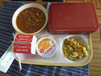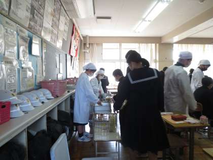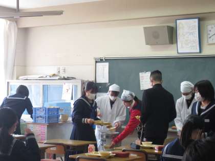 3年生の給食準備・配膳の様子です。静かにてきぱきと進めています。給食を食べるのもあと6回です。今日の献立は「ごはん,キーマカレー,ツナサラダ,いよかんゼリー,牛乳」です。