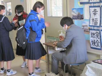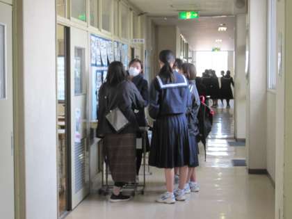 昨日、受検を終えた3年生。問題内容やテストの出来などについて担任と話をしていました。受検が終わったことへの安堵の表情も見えました。