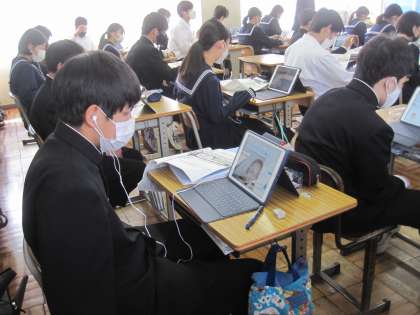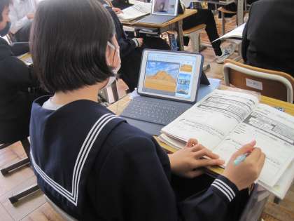2年生の英語の授業です。今日は、DMM英会話をしました。今日のテーマは「行きたい世界遺産について話したり尋ねたりしよう」です。講師の先生からも世界遺産の画像等を見せてもらいながら説明をうけていました。