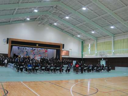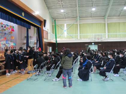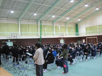 3年生が第1回目の卒業式練習を行いました。卒業式に臨むにあたっての心構え、座席の確認や座り方等の話がありました。