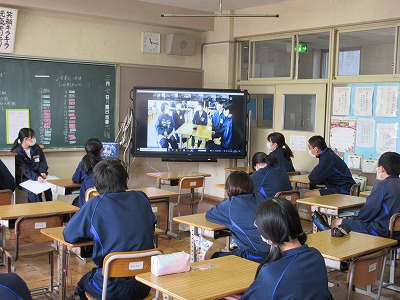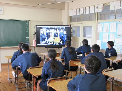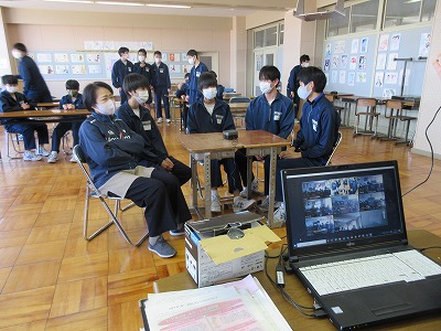とのことでした。視聴覚室でグループであるお題について話をし,一人だけ違うことを言っている人を,ZOOMで各学級につなぎ,各学級で話し合いながら探しています。文明の利器を活用すると,コロナ禍でもいろいろなことが出来ますね。