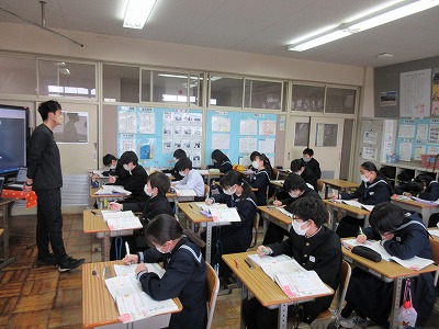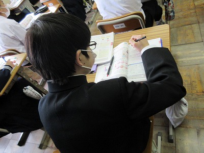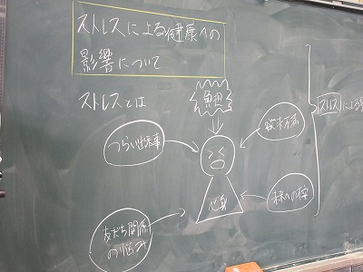 1年生の保健体育の授業です。今日は座学の保険です。「ストレスによる健康への影響」について学んでいます。みんな真剣に課題を考えています。