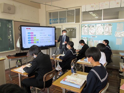 授業の様子2 公開日 2022/03/09 更新日 2022/03/09 お知らせ 2年生の英語の授業です。今日は,「Will」や「Can」を活用した5つの文構造について学んでいます。みんな一生懸命です。