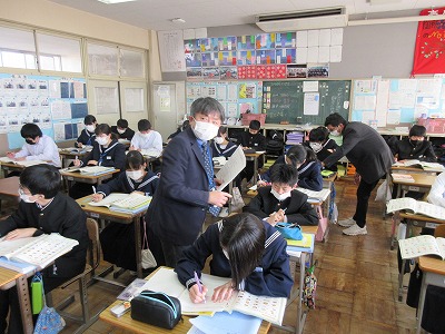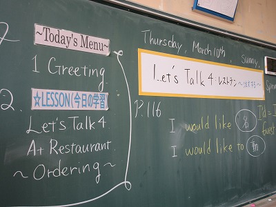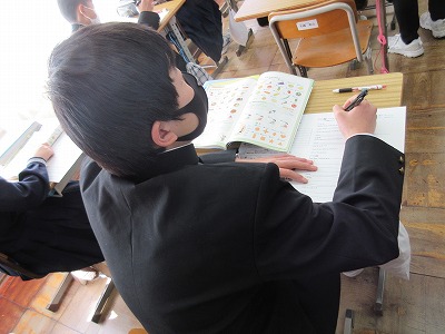 1年生の英語の授業です。今日は,「I would like 〜」「I would like to 〜」の表現について学んでいます。みんな真剣に取り組んでいます。