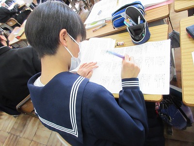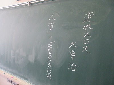 2年生の国語の授業です。今日は「走れメロス」を読み深めています。「人質」と「走れメロス」の比較をグループで話し合っています。