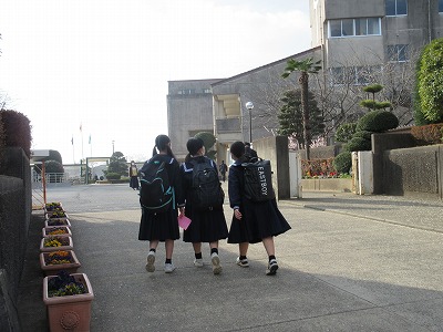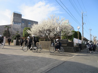 正門では満開になった梅の花が仲間達を迎えてくれます。1・2年生だけの登校初日です。元気なあいさつが聞こえます。