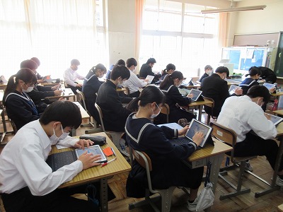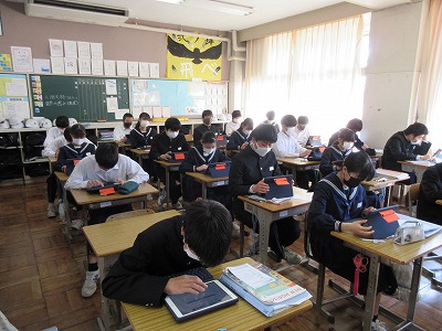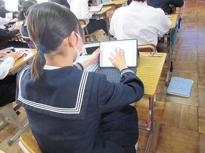 2年生の英語の授業です。DMMを活用した個別最適な学びが6回終わりました。今日はそのまとめをしています。あと2回授業で,そして春休みに残りの2回を家庭学習として実施予定です。