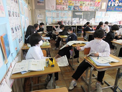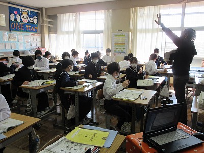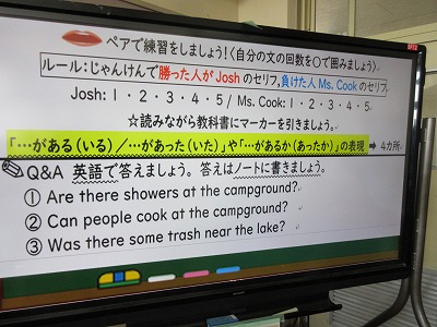 1年生の英語の授業です。今日は「〜がある(いる)」の表現について学んでいます。その表現を活用して,ペアで楽しみながら学んでいます。
