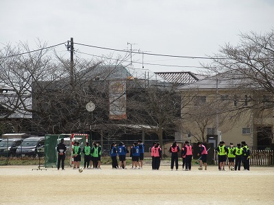 2年生の保健体育の授業です。今日は,球技「サッカー」に取り組んでいます。現在,作戦タイム中です。