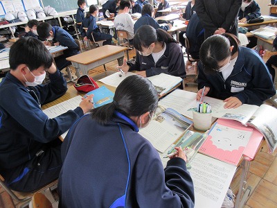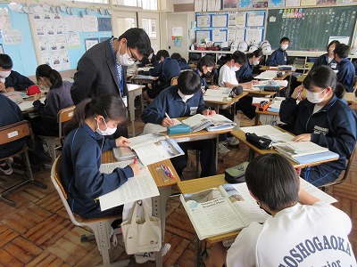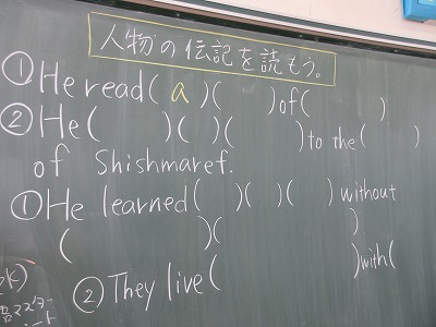 2年生の英語の授業です。今日は,教科書にある人物の伝記を読みをグループの仲間同士で読み合っています。
