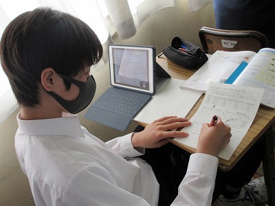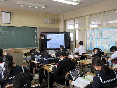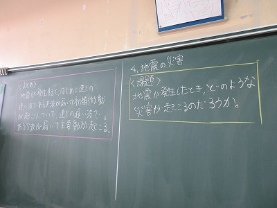 1年生の理科の授業です。地学分野です。今日は,地震が発生したときにはどのような災害が起こるかについて学んでいます。3・11,忘れてはいけません。