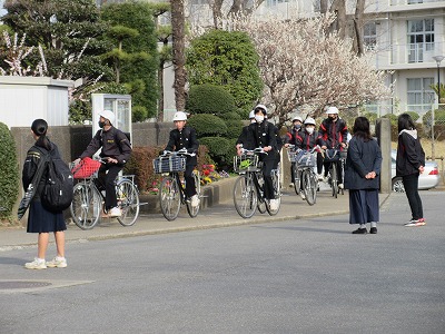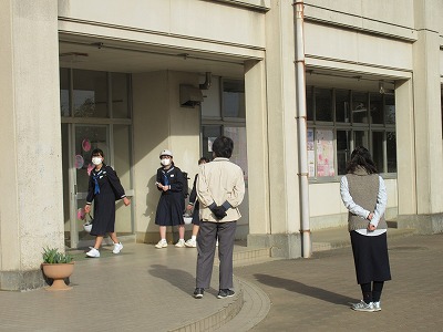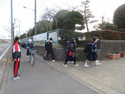 さわやかな晴れのもと,あいさつを交わしながら登校しています。今日も3年生の先生方が立哨指導・あいさつ運動をしてくださっています。心なしか登校時間が早くなっています。「時を守り」です。