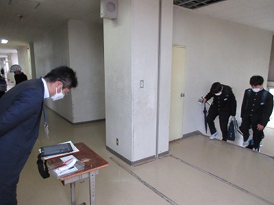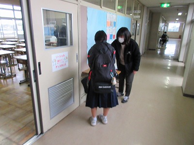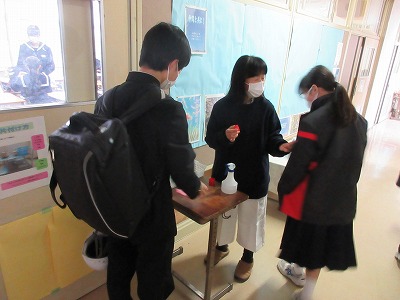 1年生の教室廊下前での健康観察チェックシートを活用した健康観察です。ここで健康を確認すると共に担任と一言交わしてから教室に入ります。学年年主任もあいさつをしながら仲間たちの登校を見守っています。