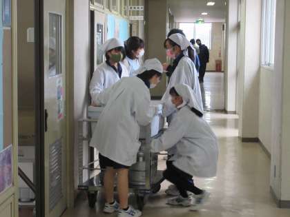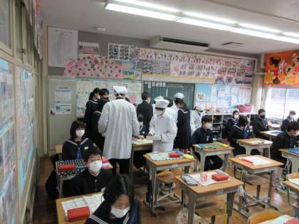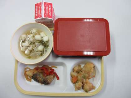 1年生の給食準備・配膳の様子です。とてもスムーズに進んでいます。今日の献立は「ごはん,あじの南蛮漬け,じゃがいものそぼろ煮,すまし汁,牛乳」です。